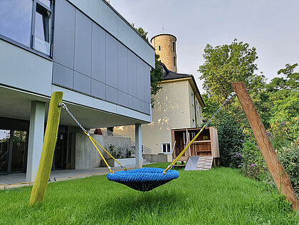 Die Kita-Kinder können in sechs sogenannten Funktionszimmern ihren Interessen nachgehen. „In unserem Forscherzimmer gibt es viel zu entdecken, was die Themen Schrift, Sprache, Mathematik und Naturwissenschaften angeht.“ Als weitere Räume stehen ein Bauzimmer, ein Bistro, ein Rollenspielzimmer mit zahlreichen Verkleidungs- und Einkaufsmöglichkeiten sowie ein Atelier zum Malen und Basteln bereit. „Außerdem haben wir einen Snoozle-Raum. Damit bieten wir den Kindern einen Rückzugsort zum Bücheranschauen oder Ausruhen“, berichtet Katharina Gilles. Im Außenbereich haben die Kinder viele Möglichkeiten, sich zu bewegen und zu werkeln.
