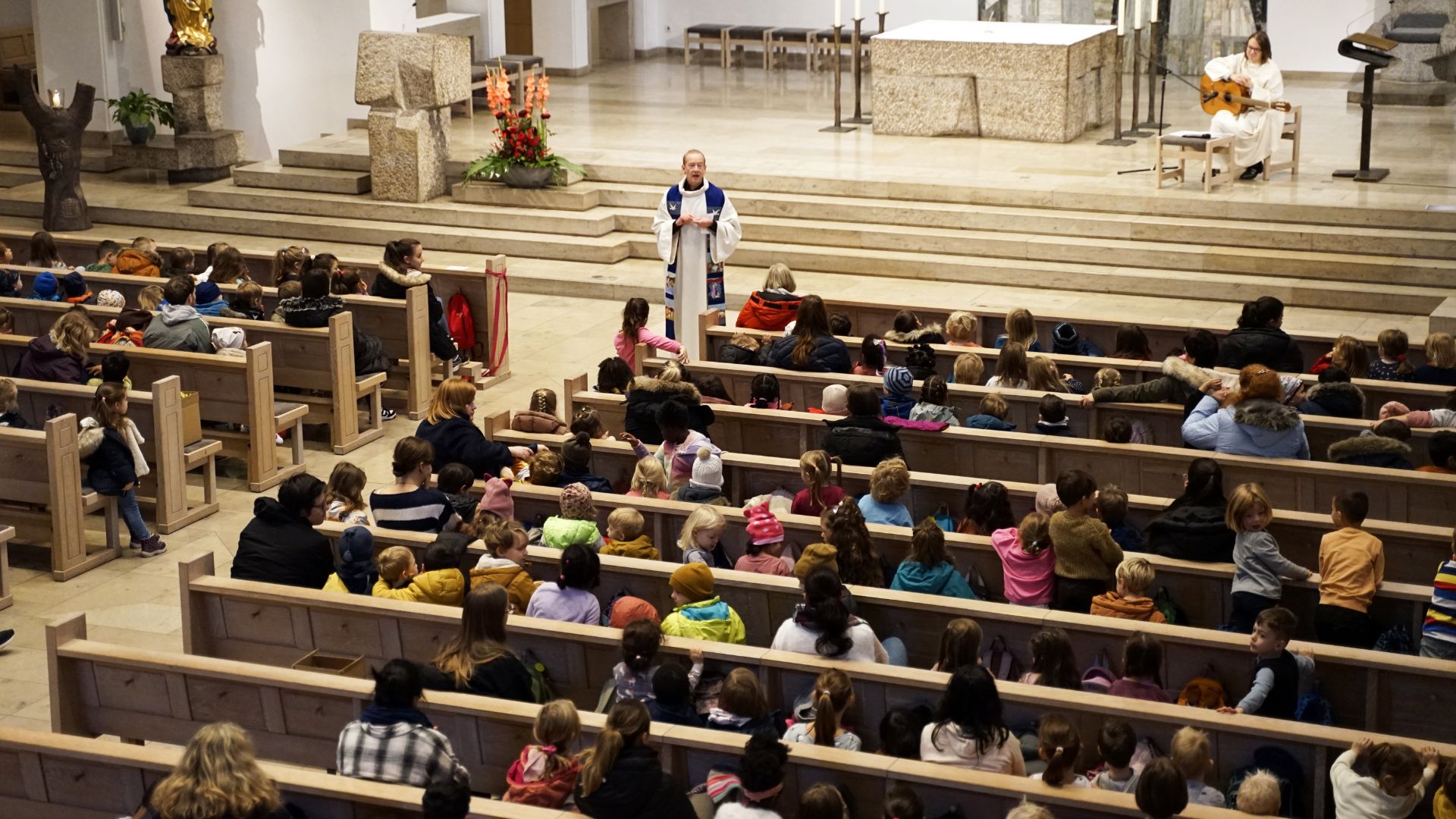 Stadtdekan Christian Hermes erzählte die Bibelgeschichte von Jona und dem Wal. Er ermutigte die Kinder für die Themen, die ihnen wichtig sind, einzustehen und mutig zu sein. „So wie Gott den Wal – und damit auch Jona – zum Ufer gelotst hat, so ist Gott auch für euch da und begleitet euch immer auf eurem Weg“, sicherte Angela Schmid den Kindern zu.
